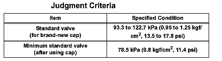 If the maximum pressure is less than the specified pressure for the minimum standard valve, replace the radiator cap sub-assembly.