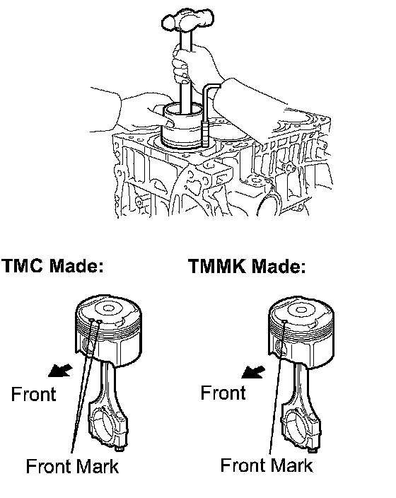 (c) Align the front marks of the piston and connecting rod, and push in the piston with your thumb.