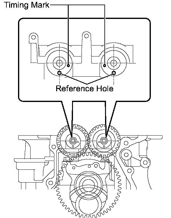 (e) Install the stiffening crankcase so that the reference holes on the balance shafts are positioned as shown in the illustration.