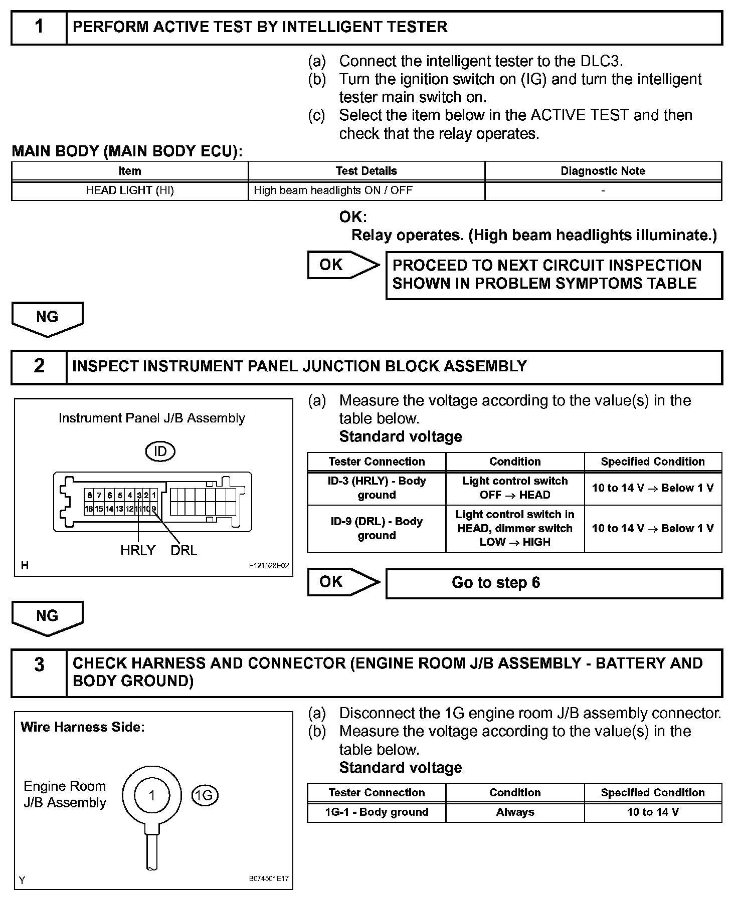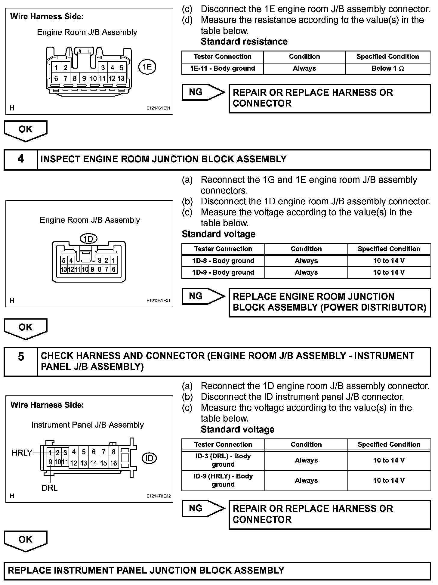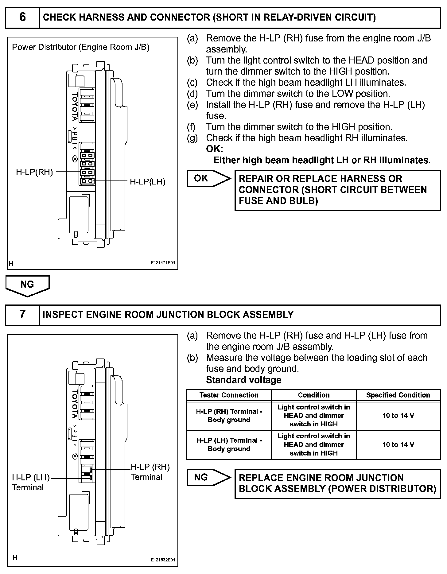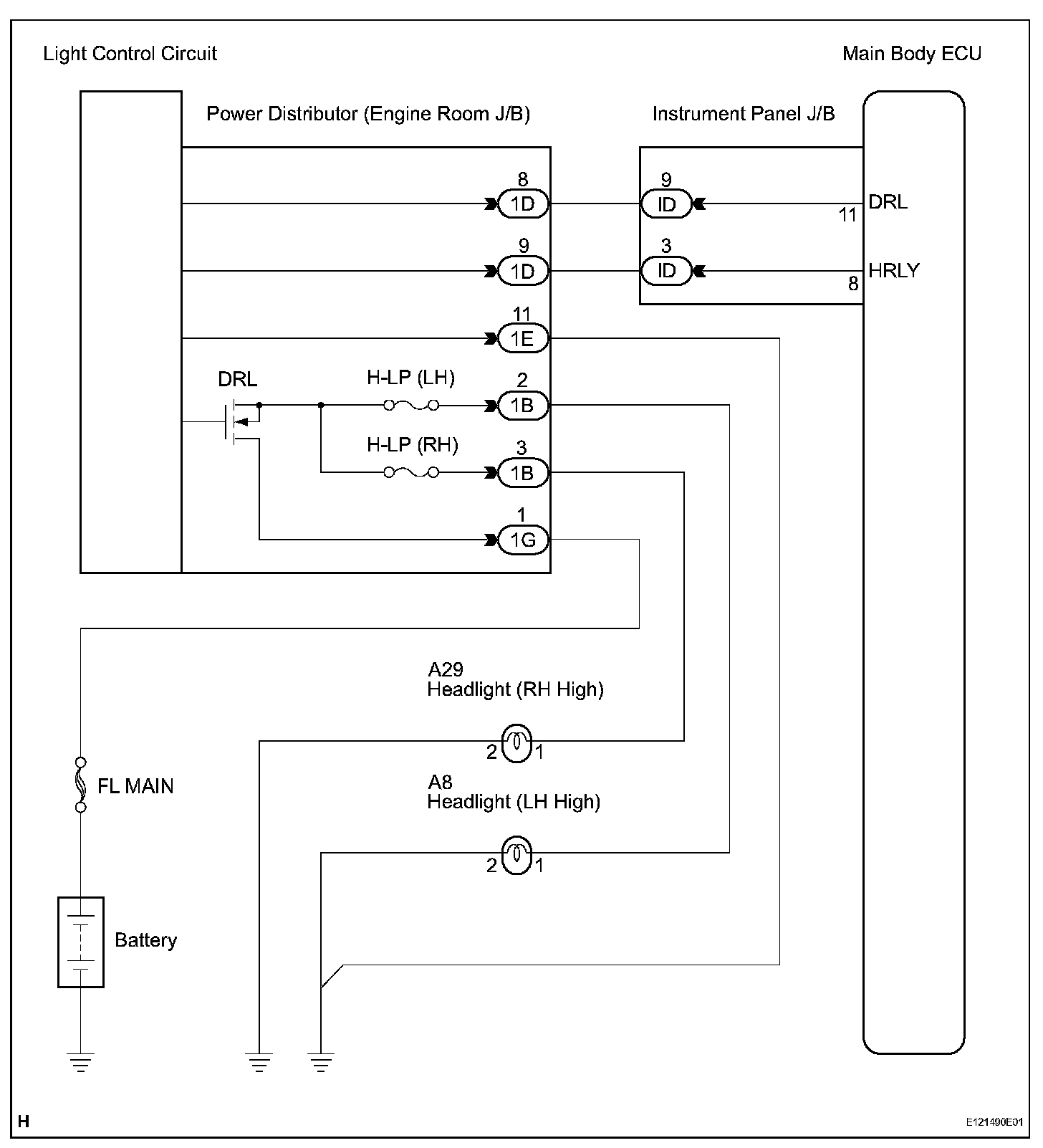 HINT: When a short circuit occurs between the power distributor (engine room J/B assembly) and high beam headlight, the power distributor stops the DRL relay operation (Fail-safe function).