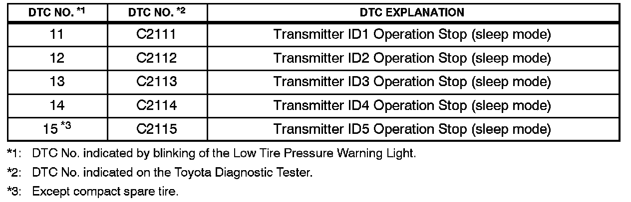 4. Check that the sleep mode DTCs are NOT stored in the system. If the sleep mode DTCs are stored, increase the tire inflation pressure of all 5 tires to 44 psi (3.0 kgm/sq.2, 300 kpa) and repeat steps 1 - 3.