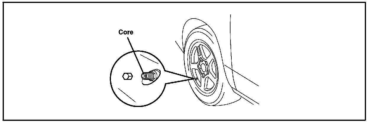 2. Press the valve core to reduce the tire inflation pressure rapidly by 6 psi (0.4 kgf/sq.2, 40 kpa) or more within 30 seconds. If the tire inflation pressure is NOT reduced by 6 psi (0.4 kgf/sq.2, 40 kpa) or more within 30 seconds, the tire pressure sensing transmitters will NOT be activated.