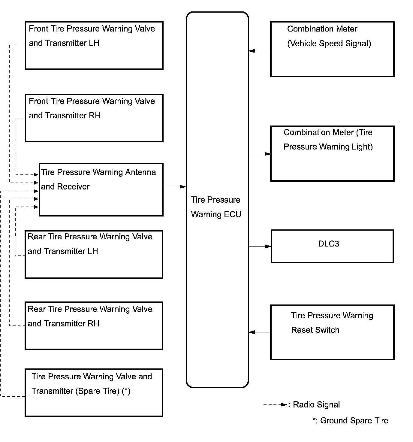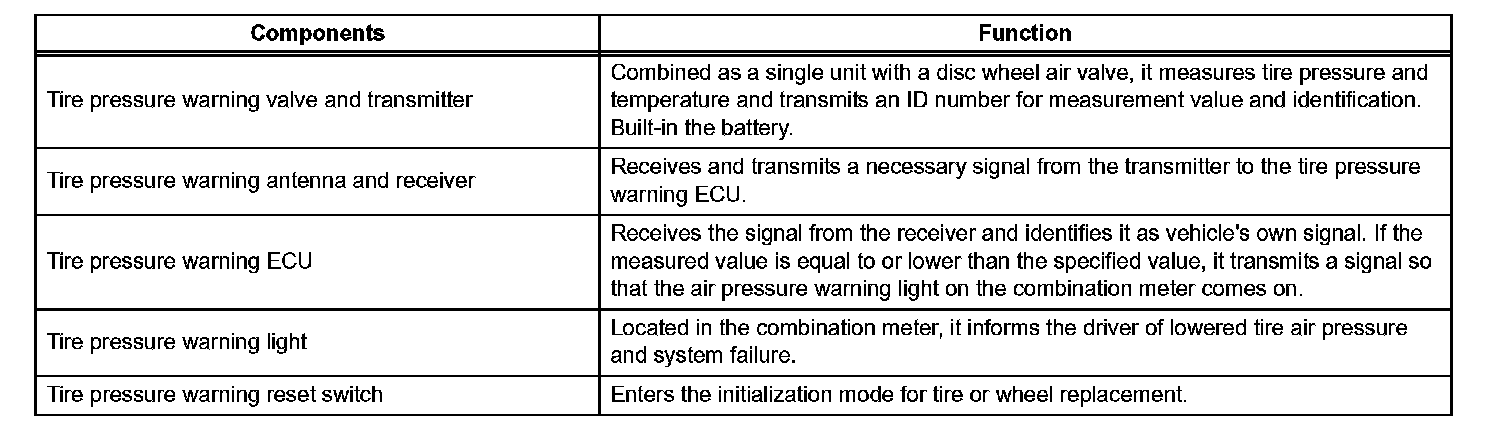 - During initialization, the tire pressure warning valve and transmitter measures the inflation pressure of the tires, and registers the signals that are transmitted into the tire pressure warning ECU at a frequency of once per minute. The initialization process is completed when signals from the all tires (including the ground spare tire) have been received.