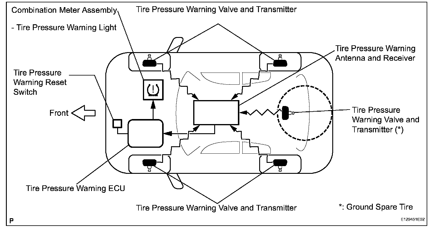 (a) A tire pressure warning valve and transmitter is equipped with a tire pressure sensor and a transmitter and is installed in a tire wheel assembly. The sensor measures the tire pressure. The measured value and transmitter ID are transmitted to the tire pressure warning antenna and receiver on the body as radio waves and then sent to the tire pressure warning ECU from the tire pressure warning antenna and receiver. If the transmitter ID has already been registered, the ECU compares the measured air pressure value with the standard value. When the value is less than the standard value registered in the tire pressure monitor ECU, the warning light on the combination meter comes on.