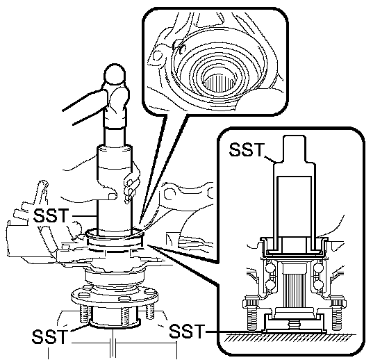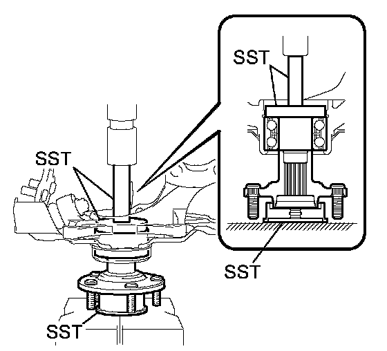 (b) Using SST and a press, press the front axle hub bearing until it contacts the SST.