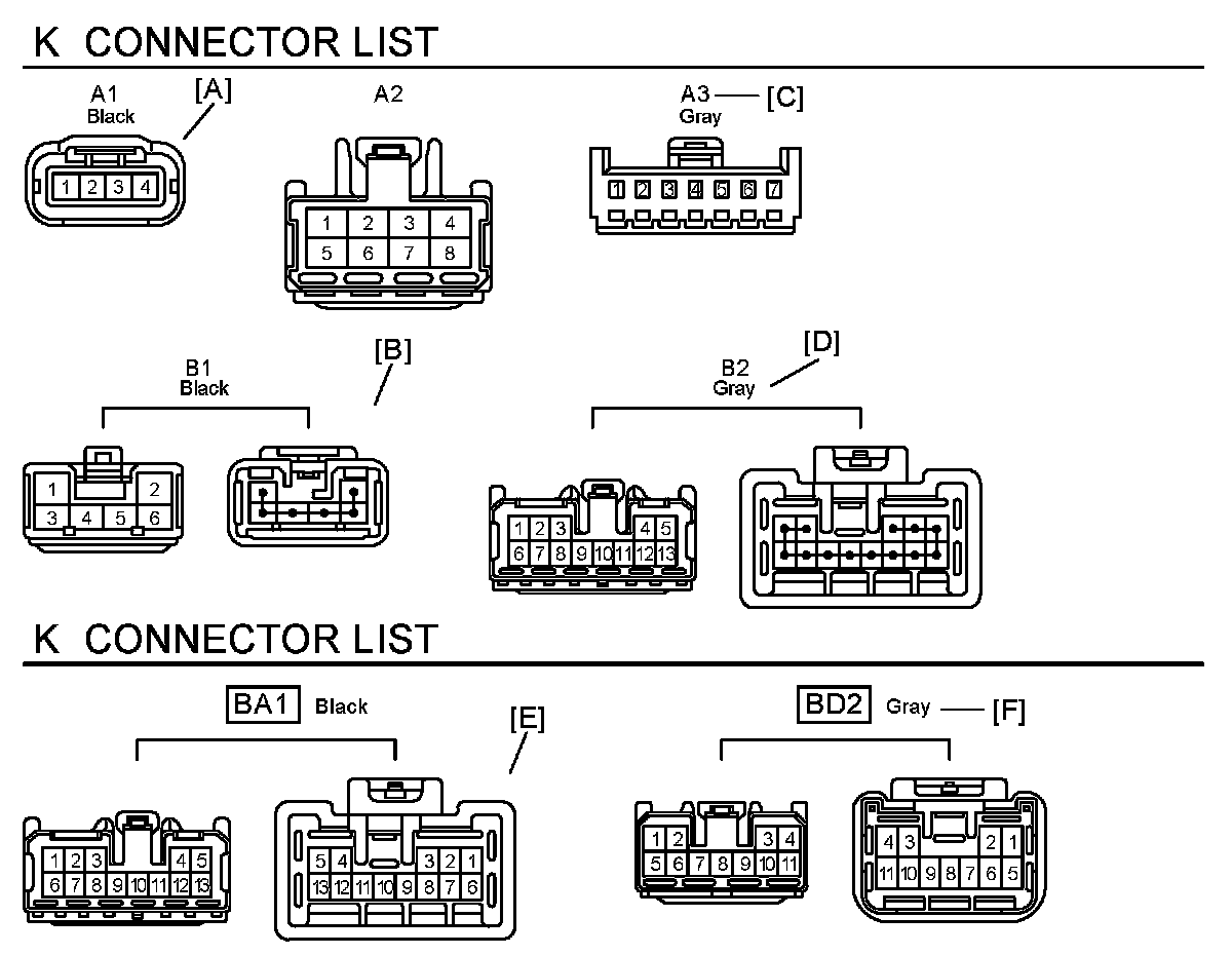 [E]: Indicates the connector shapes which are used to join wire harnesses.