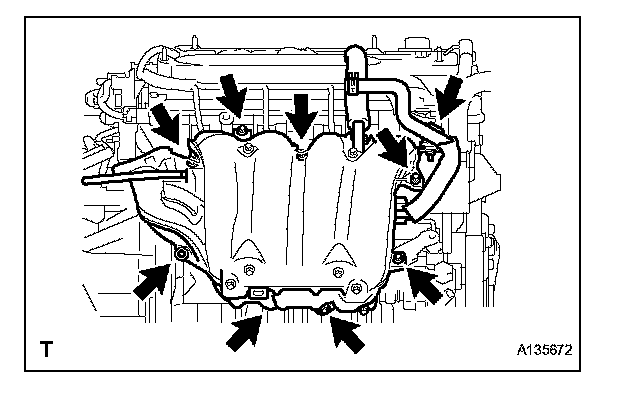 b. Install the intake manifold with the 5 bolts and 2 nuts.