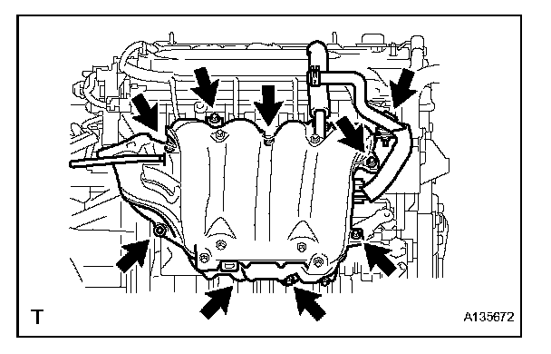 e. Remove the 5 bolts, 2 nuts and intake manifold.