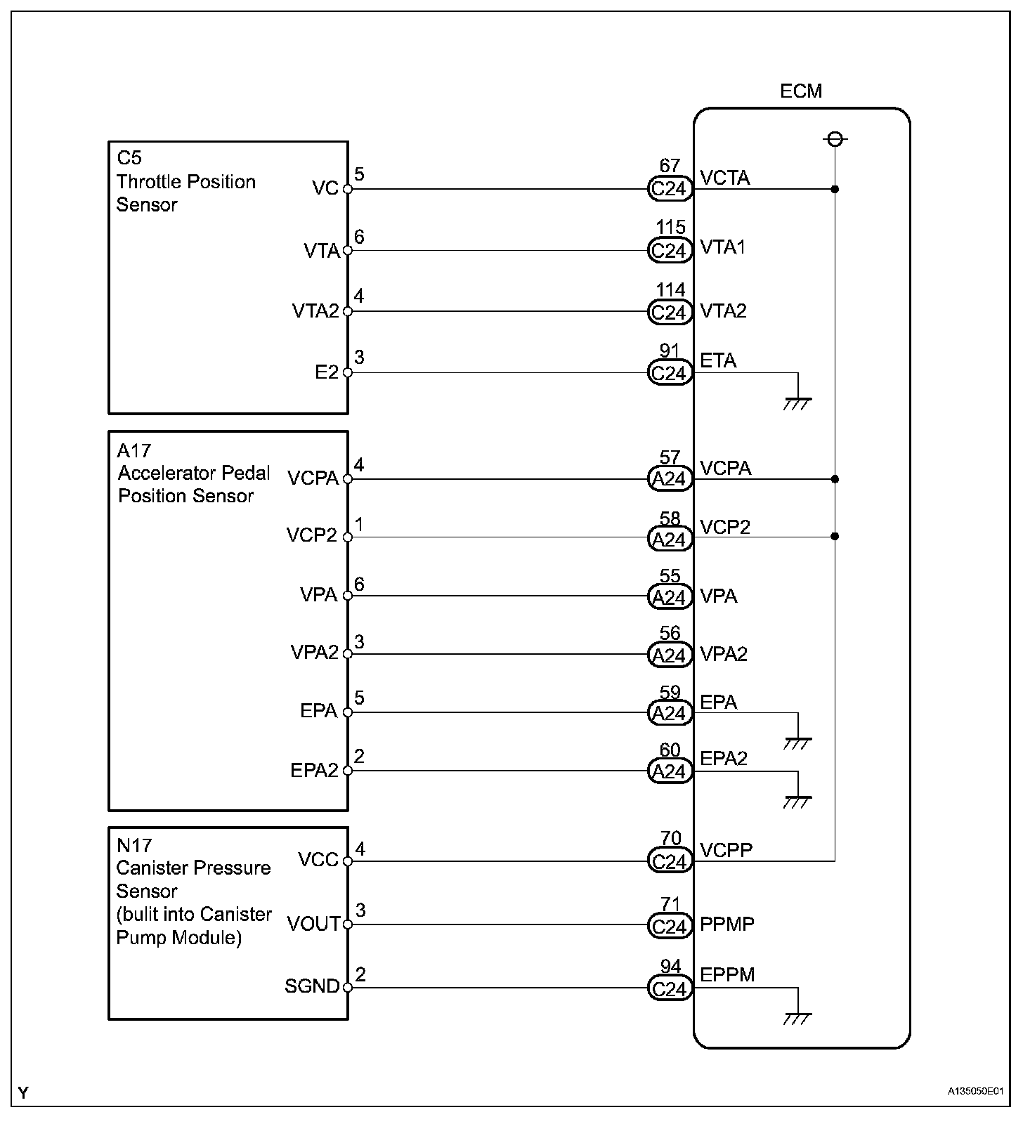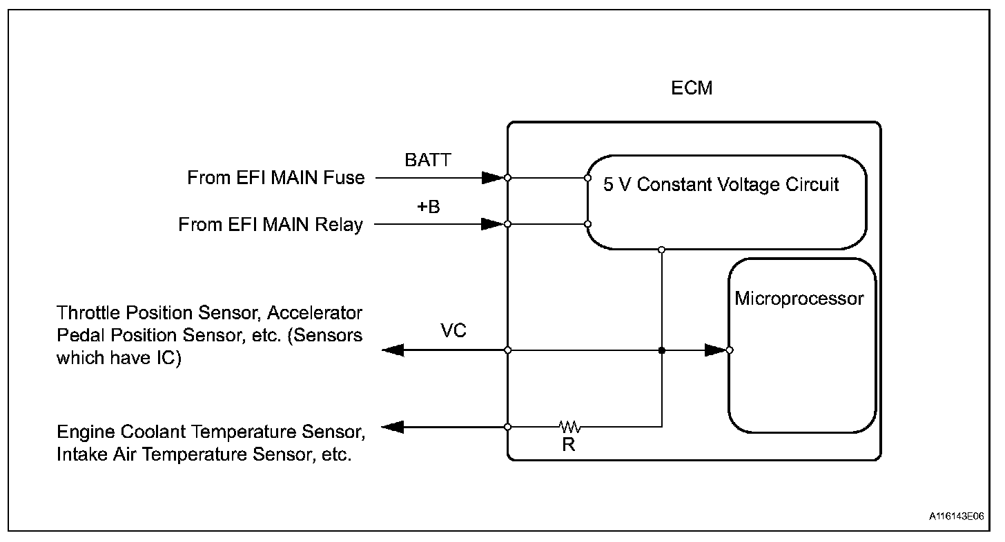 The ECM constantly generates 5 V power from the battery voltages supplied to the +B (BATT) terminal to operate the microprocessor. The ECM also provides this power to the sensors through the VC output circuit.