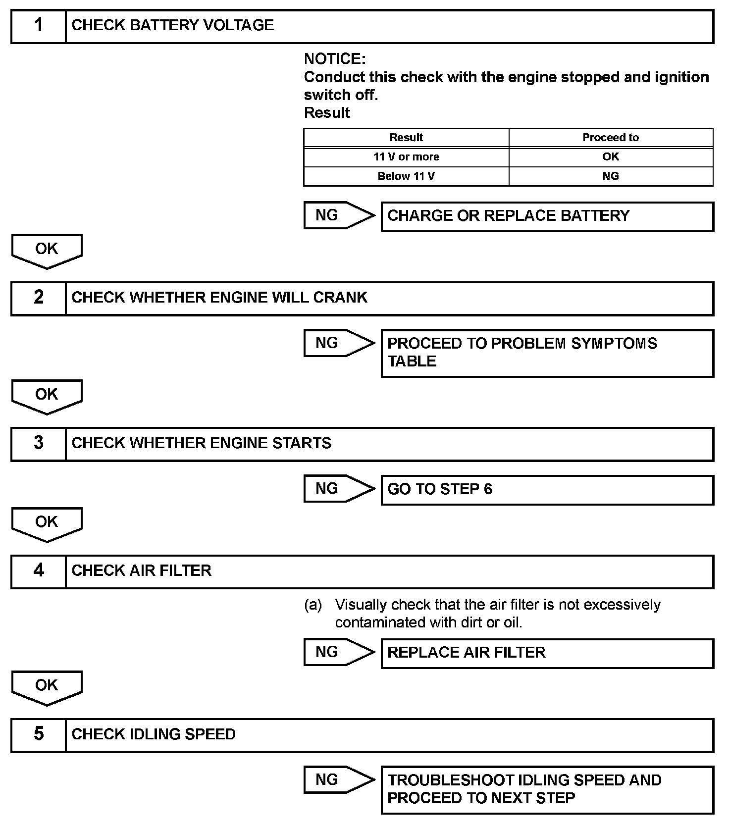When a malfunction is not confirmed by the DTC check, troubleshooting should be carried out in all circuits considered to be possible causes of the problem. In many cases, by carrying out the basic engine check shown in the flowchart, the location of the problem can be found quickly and efficiently. Therefore, using this check is essential when engine troubleshooting.