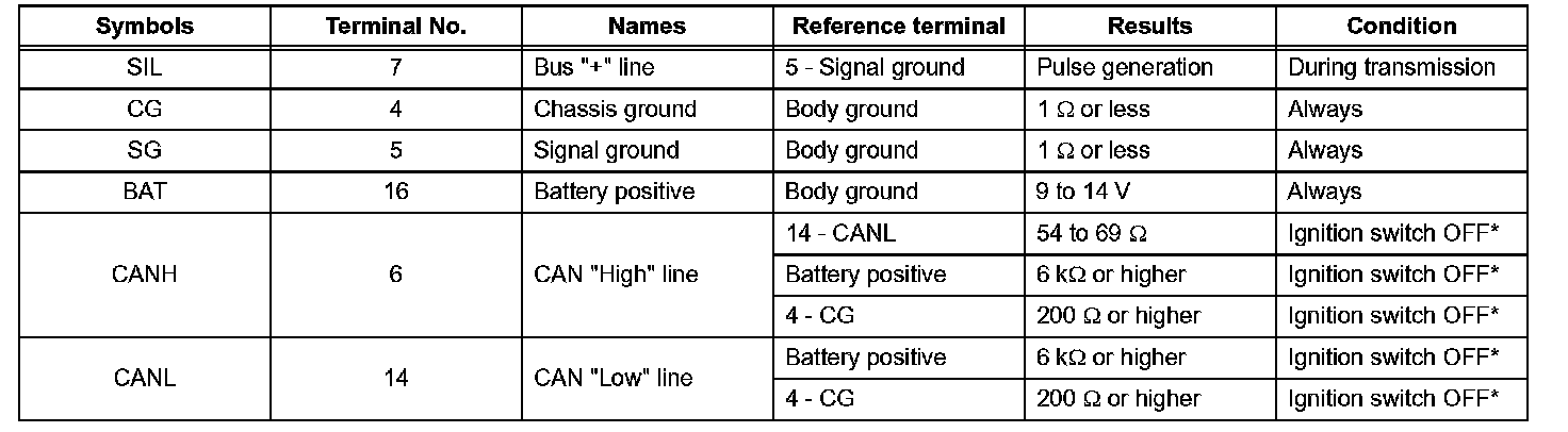 CAUTION: *: Before measuring the resistance, leave the vehicle as it is for at least 1 minute and do not operate the ignition switch, any other switches or the doors. If the result is not as specified, the DLC3 may have a malfunction. Repair or replace the harness and connector.