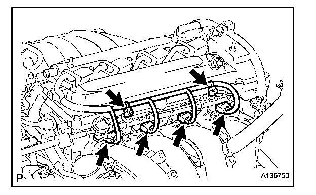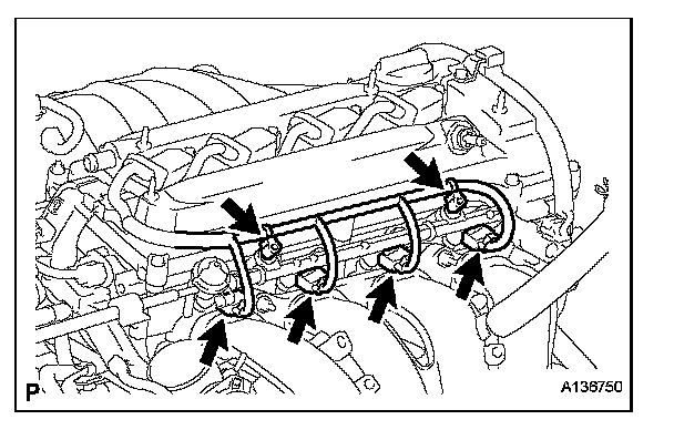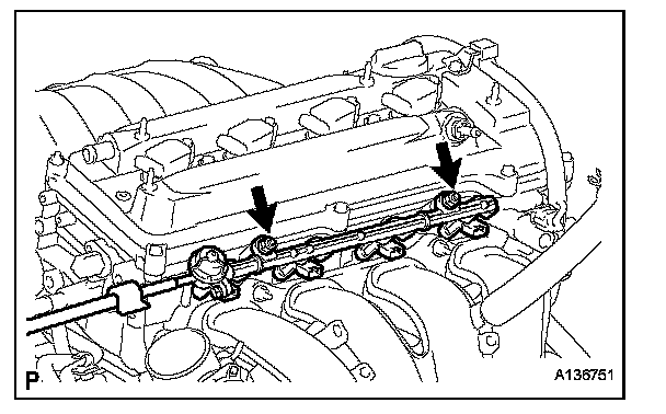 c. Remove the 2 bolts, then remove the fuel delivery pipe together with the 4 fuel injectors.