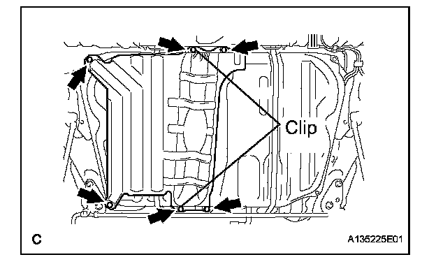 b. Install the fuel tank protector with the 4 bolts and 2 clips (for SE Grade).