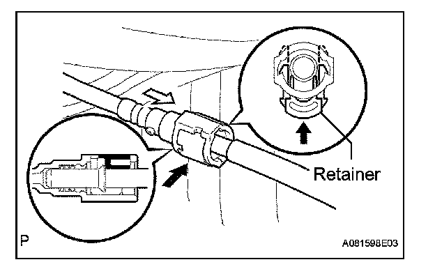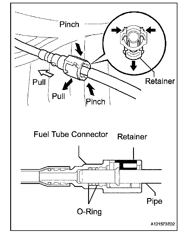 1. Push the fuel connector into the pipe and push up the retainer so that the claws engage.