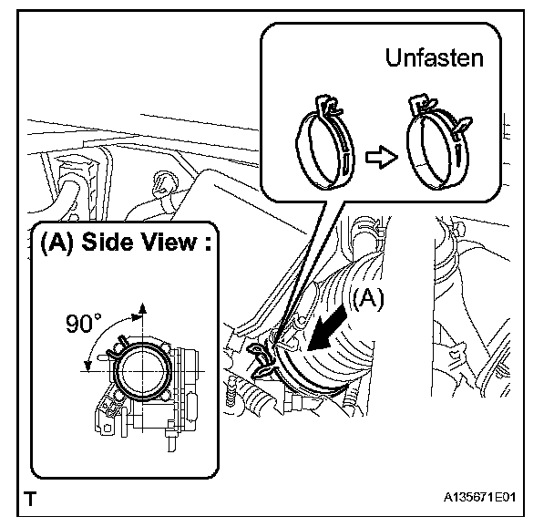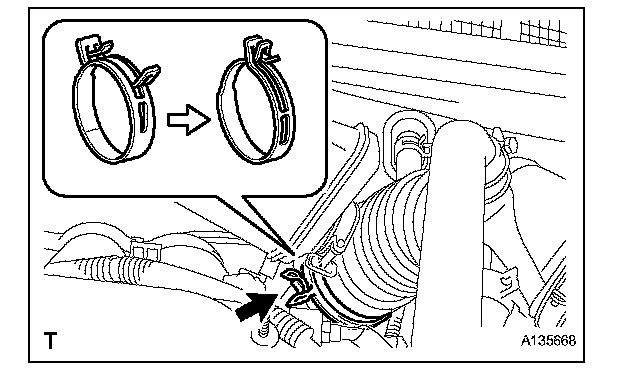 c. Align the matchmarks of the No. 1 air cleaner hose and throttle body, and then connect the air cleaner hose No. 1 to the throttle body and unfasten the No. 1 air cleaner hose clamp.