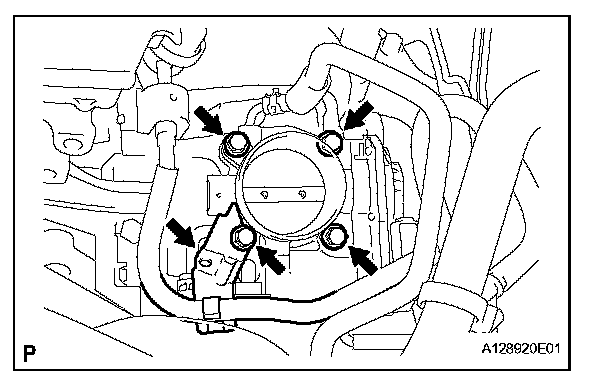 b. Remove the 4 bolts, and then remove the fuel pipe support and throttle body.