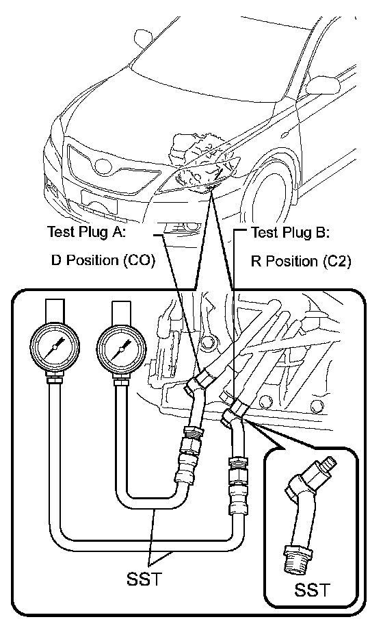 (14) Remove the test plug B, install the SST and start engine.