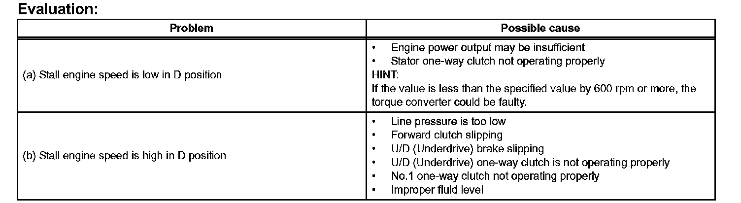 The object of this test is to check the overall performance of the transaxle and engine by measuring the stall speeds in the D position.