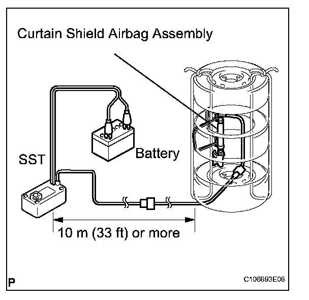 - When deploying the airbag, perform the operation at least 10 m (33 ft) away from the curtain shield airbag assembly.