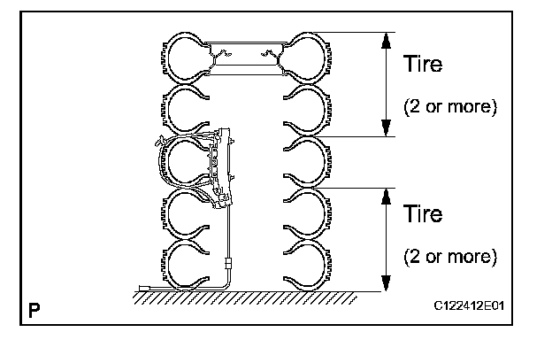1. Place at least 2 tires under the tire which the driver side knee airbag assembly is tied to.