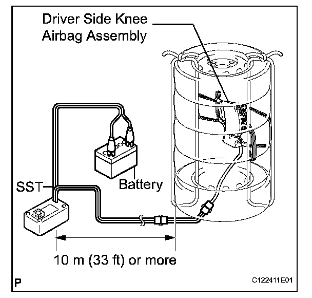 - When deploying the airbag, perform the operation at least 10 m (33 ft) away from the driver side knee airbag assembly.