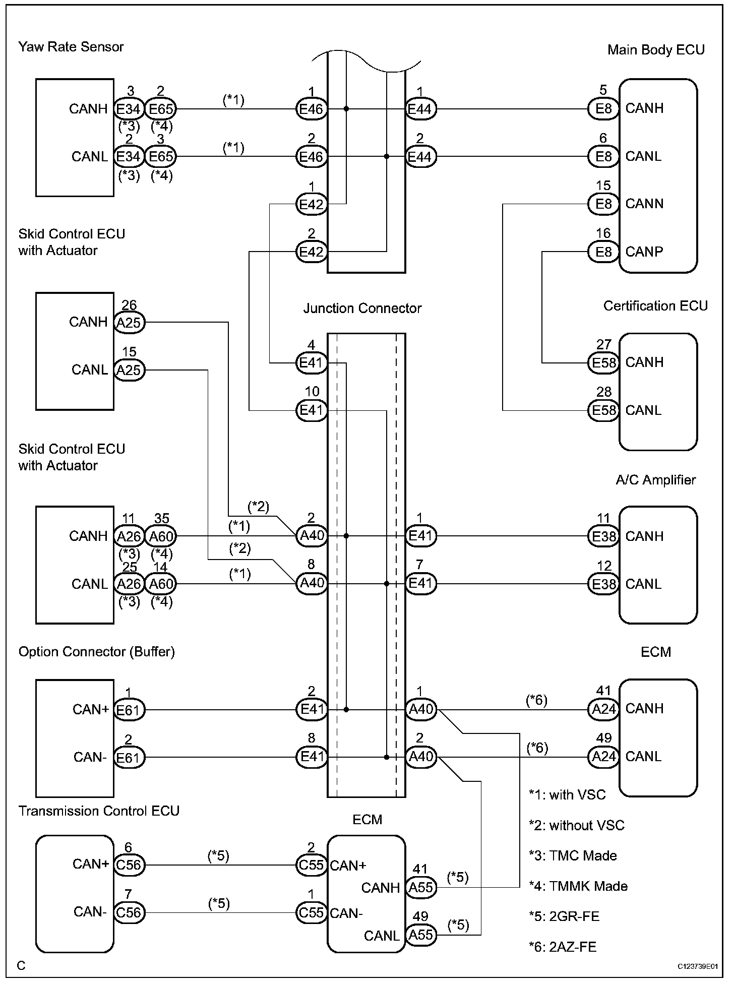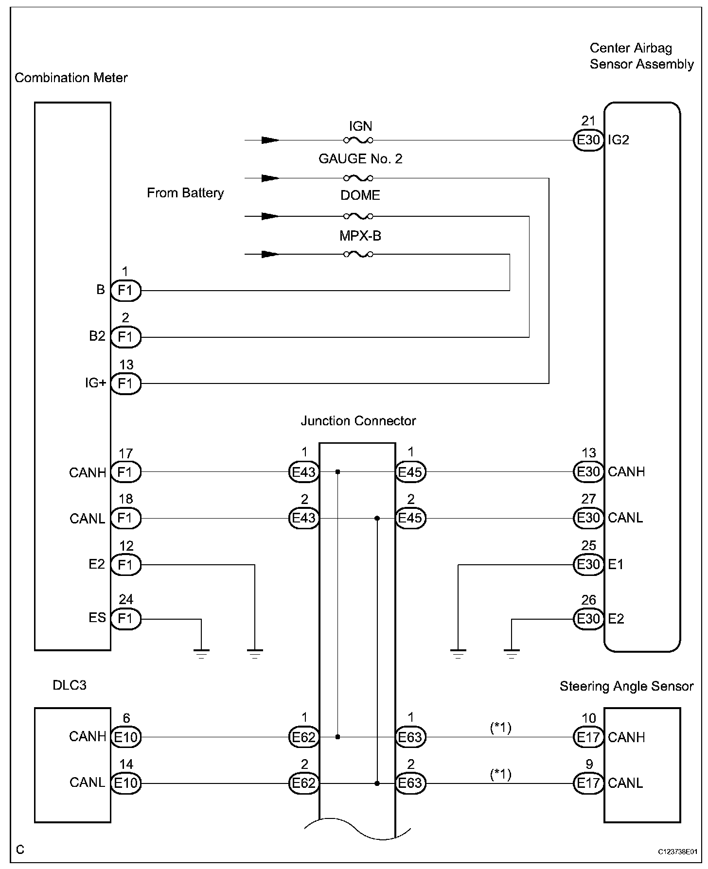 The signal to illuminate the SRS warning light is transmitted from the center airbag sensor assembly to the combination meter assembly through the CAN communication system.