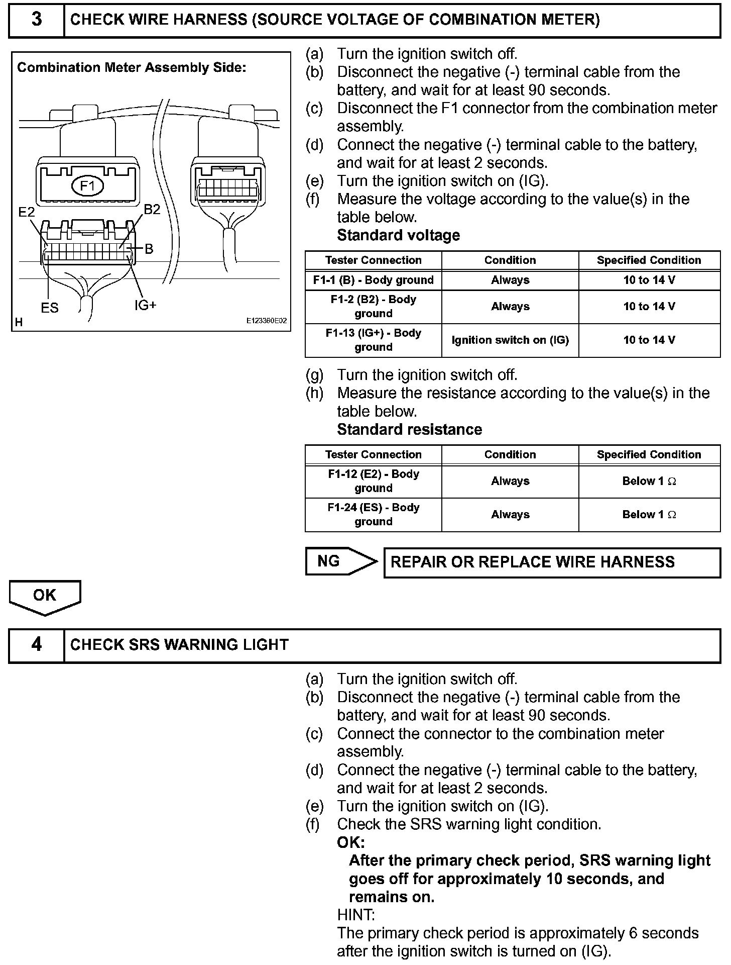 When terminals TC and CG of the DLC3 are connected, the DTC is displayed by blinking of the SRS warning light.