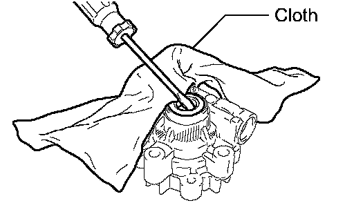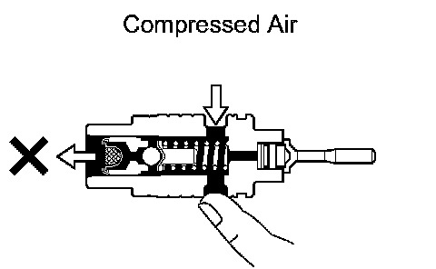 (b) Check the flow control valve assembly for leakage. Close one of the holes and apply compressed air, 392 to 490 kPa (4 to 5 kgf/cm2, 57 to 71 psi), into the opposite side hole, and confirm that air does not come out from the end holes.