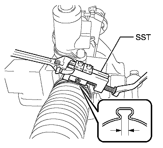 (a) Using SST, tighten the 2 No. 2 steering rack boot clamps as shown in the illustration.