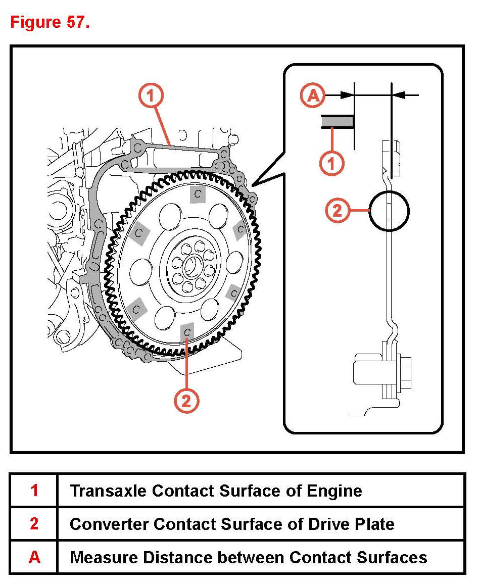 D. Using a vernier caliper and a straightedge measure dimension "A" between the transaxle contact surfaces of the engine and the converter contact surfaces of the drive plate.