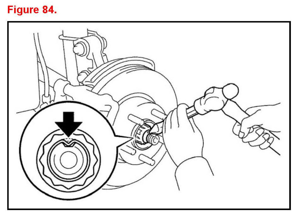 C. Using a chisel and hammer stake the front axle hub nut.