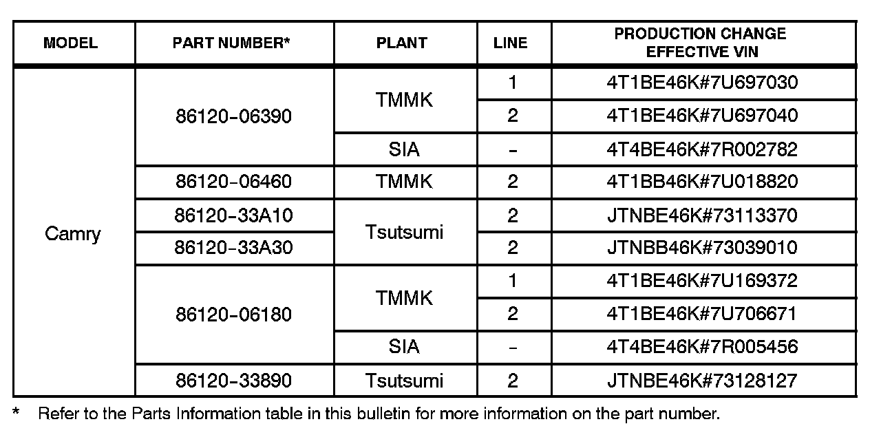 ^ 2007 model year Camry vehicles produced BEFORE the Production Change Effective VINs shown below.