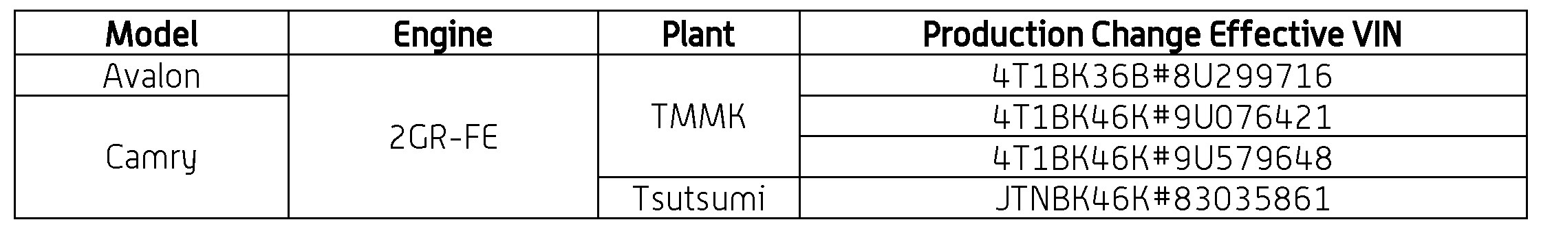 - Model: Camry or Avalon