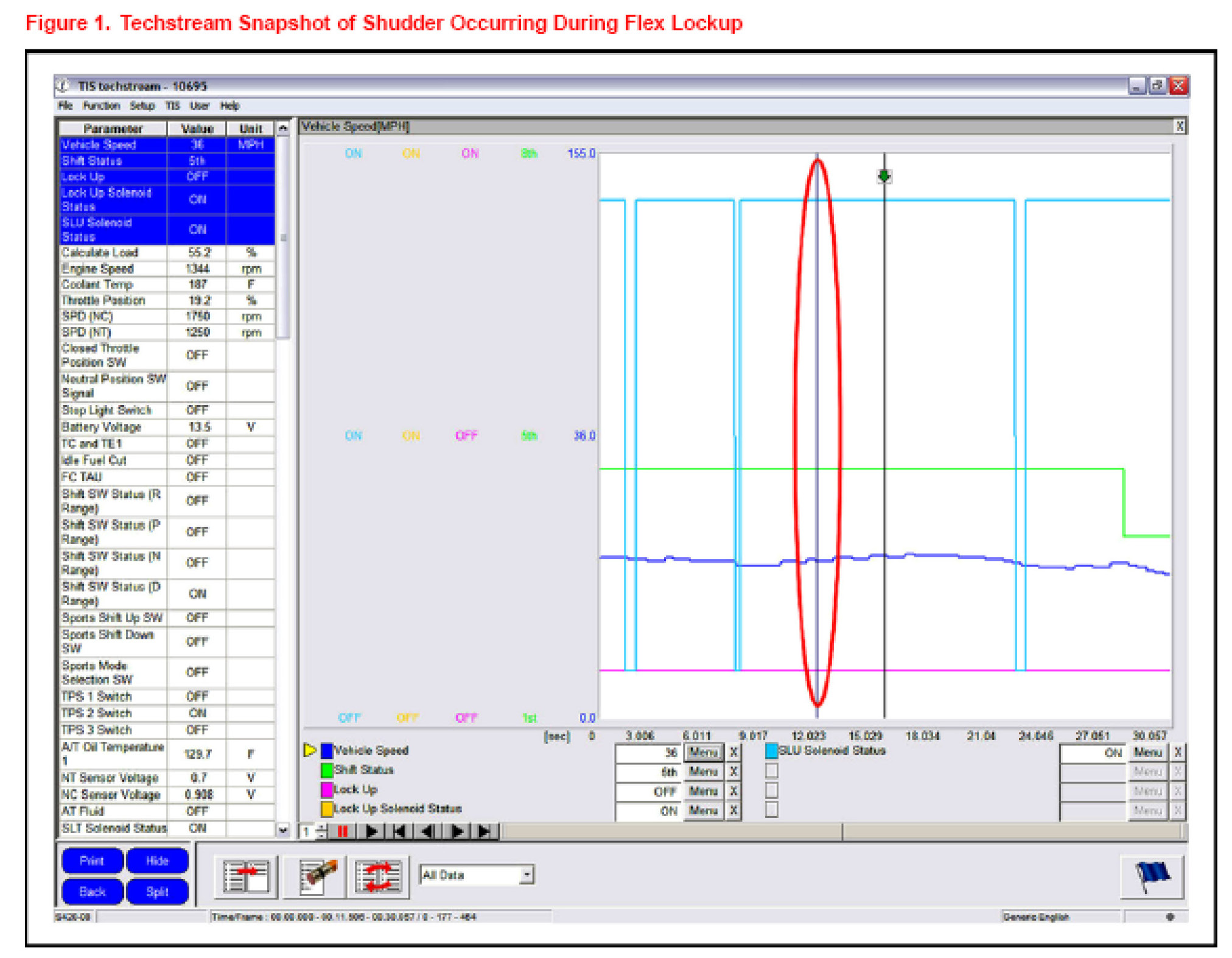 3. Use Techstream to take a snapshot when shudder is occurring to determine if it's occurring during flex lockup.