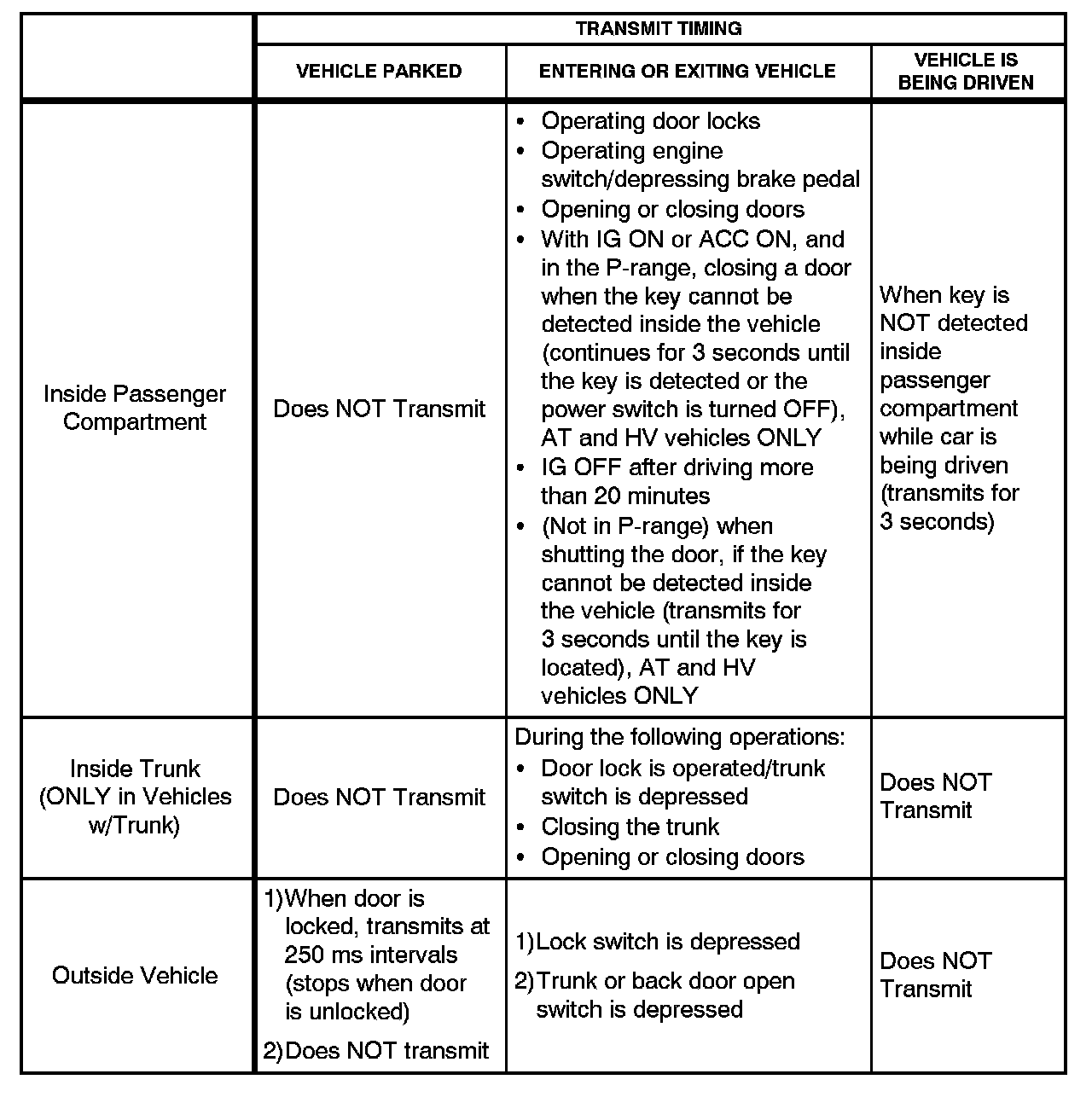 Some customers may inquire about the frequency and power output of the Smart Key/Smart Entry Systems used on various models. The Smart Key/Smart Entry systems conform to all applicable FCC rules. This bulletin details the applicable specifications for these systems.