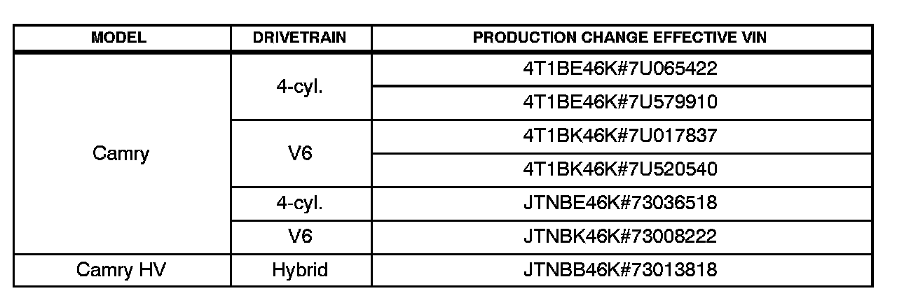 ^ 2007 model year Camry and Camry HV vehicles produced BEFORE the Production Change Effective VINs shown below.