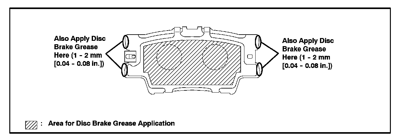 c. Apply a small amount of the disc brake grease (1 - 2 mm [0.04 - 0.08 in.] thick) to the areas shown in the illustration.