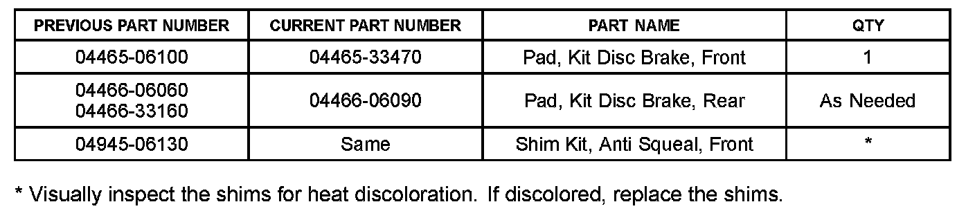 2. Replace the front brake pads with the improved kit. Visually inspect the shims for heat discoloration. If discolored replace the shims.