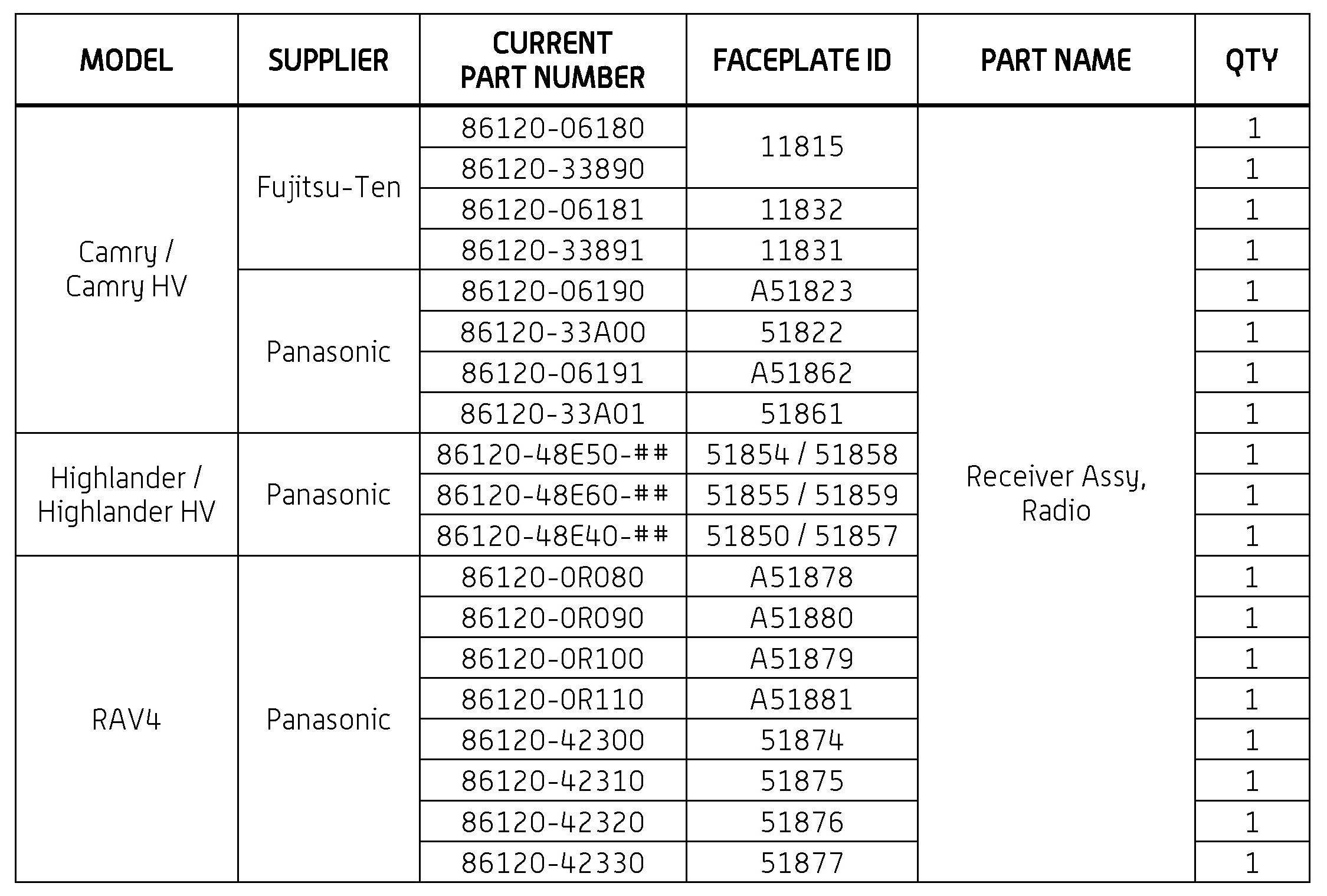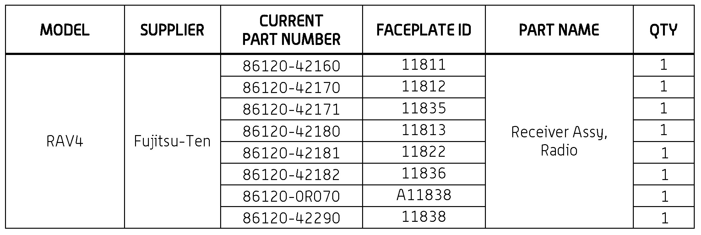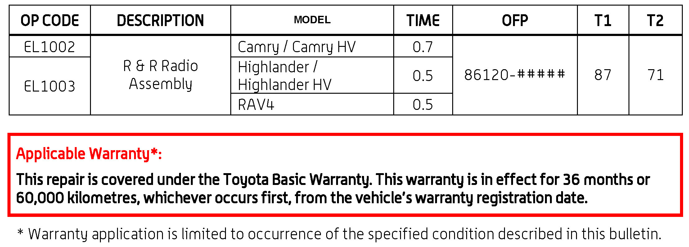 1. Order a replacement radio through the applicable radio exchange program per the Toyota Warranty Policy and Procedures: Policy 11.1 "Entertainment/Navigation Systems Program".