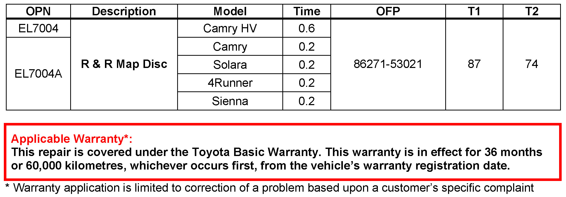 - Model: Camry, Camry HV, Solara, 4Runner, and Sienna Year: 2007