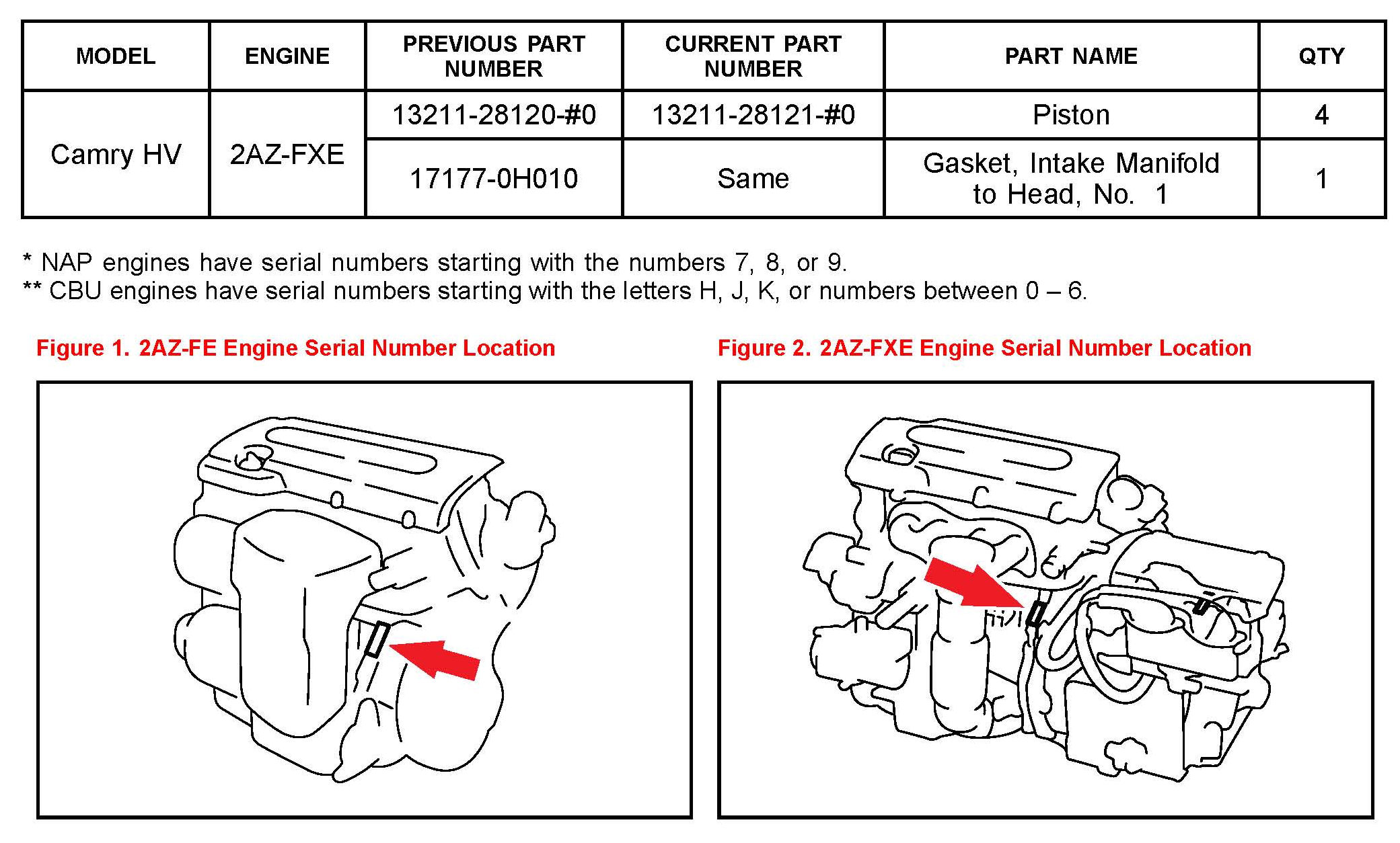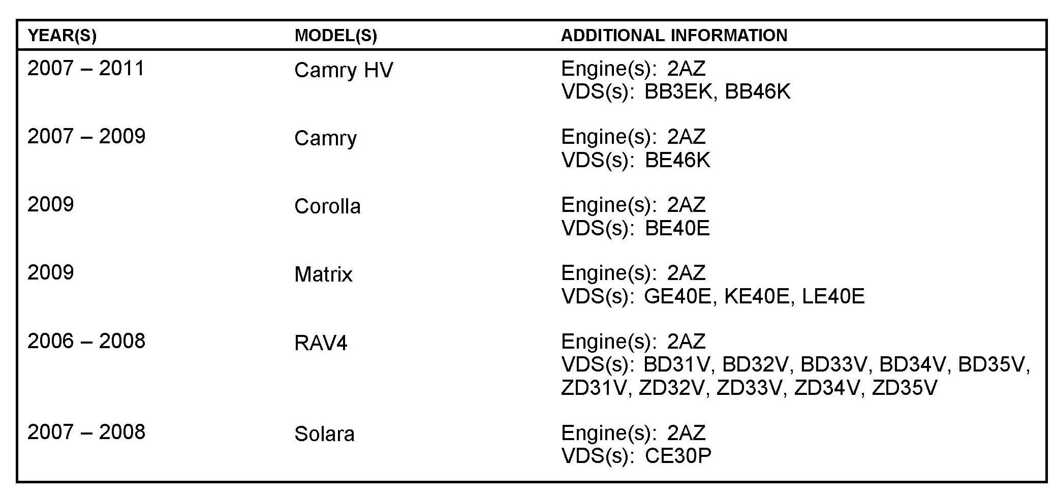 Some 2006 - 2011 model year vehicles equipped with the 2AZ-FE engine may exhibit engine oil consumption. The piston assembly has been changed to minimize oil consumption. Use the following repair procedure to address this condition.