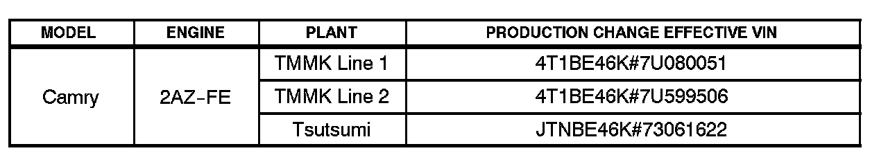 ^ 2007 model year Camry vehicles equipped with 2AZ-FE engine and 5-speed automatic transmission produced BEFORE the Production Change Effective VINs shown below.