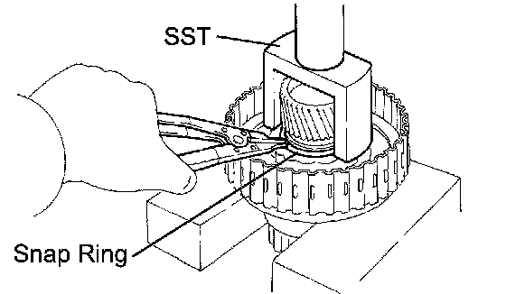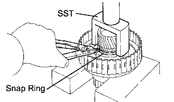 (e) Using a snap ring expander, install the snap ring to the underdrive clutch drum.