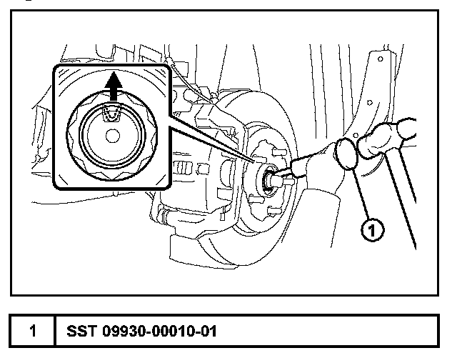 A. Using the SST and a hammer, release the staked part of the front axle hub nut.