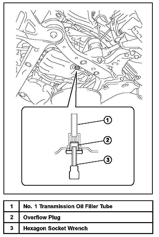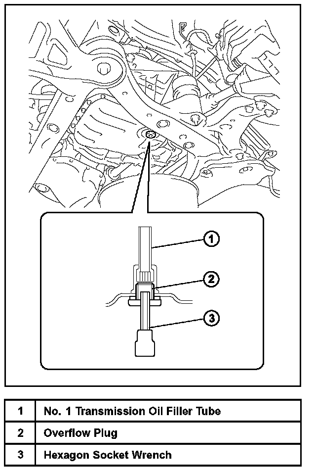 A. Using a 6 mm hexagon socket wrench, remove the overflow plug and gasket from the automatic transaxle.