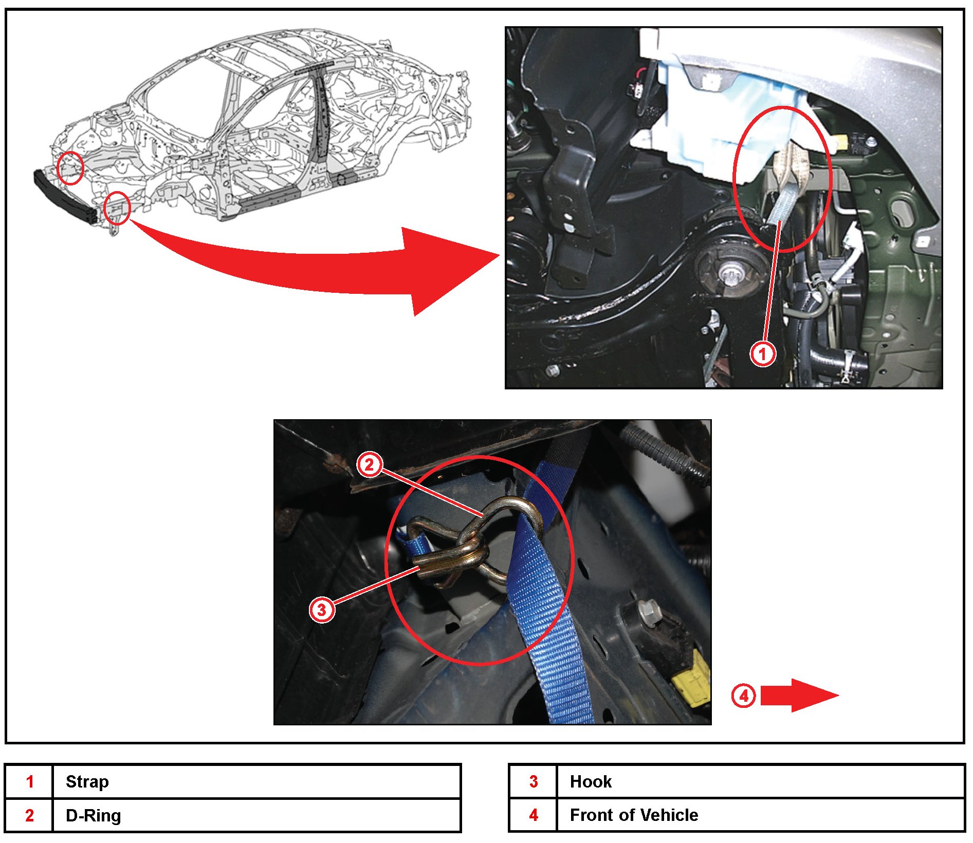 A. Loop the strap over the frame rail rearward of the radiator support and secure the hook to the strap's floating D-ring.