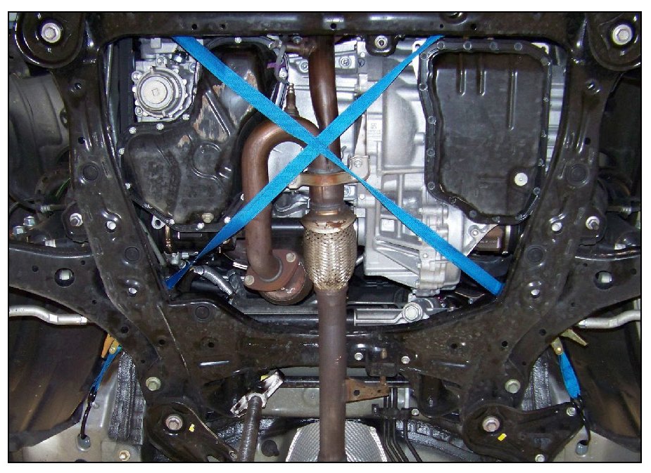 B. Feed the strap over the sub-frame and under the engine in an "X" pattern.