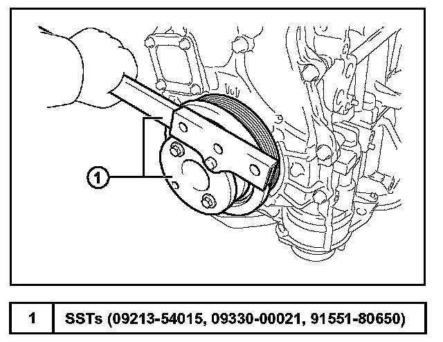 B. Using the SSTs, hold the crankshaft pulley while removing the flex plate bolts. SST can also be used to rotate engine to access the next bolt to remove.
