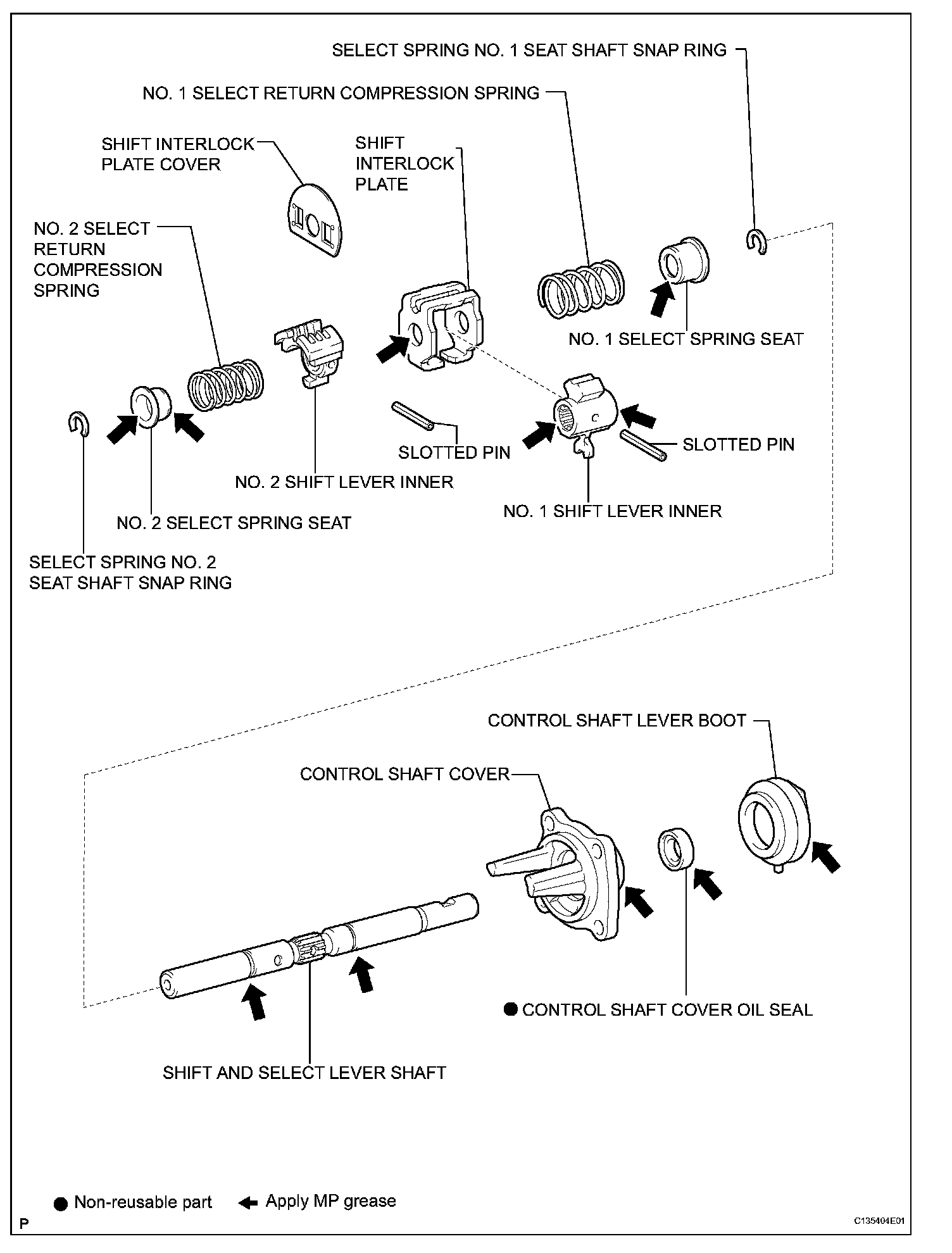 (a) Remove the shift inter lock plate, No. 1 select return compression spring and No. 1 select spring seat from the shift and select lever shaft.