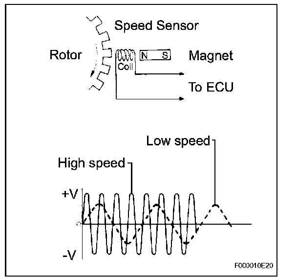 Since the frequency of this AC voltage changes in direct proportion to the speed of the rotor, the frequency is used by the ECU to detect the speed of each wheel.